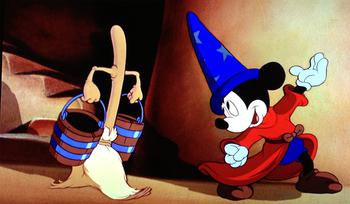 Mickey appeared on several animated logos for Walt Disney Home Entertainment, starting with the "Neon Mickey" logo and then to the "Sorcerer Mickey" logos used for regular and Classics release titles.